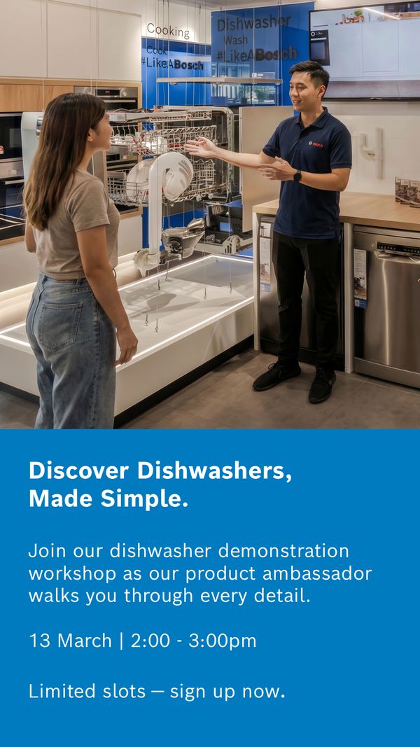 Dishwasher Demo Workshop 13 March 2026| 2:00 – 3:00pm Bosch Flagship Experience Centre |